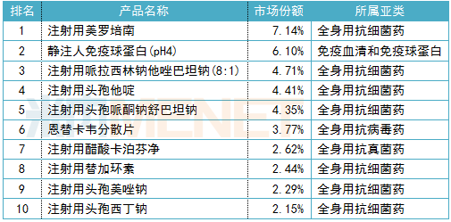 2019年湖南省公立医院全身用抗感染化药产品TOP10