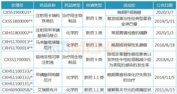 注:带*为优先审评品种,**为特殊审评+优先审评品种,/*为重大专项+特殊审评品种