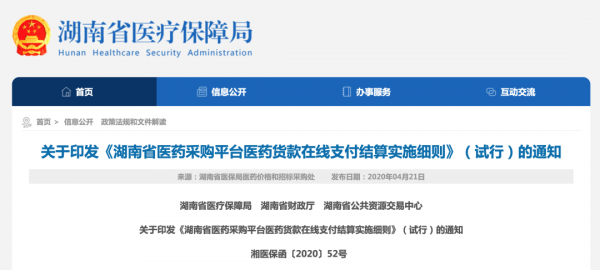 4月21日,湖南省医保局官网挂出关于印发《湖南省医药采购平台医药货款在线支付结算实施细则》(试行)的通知(下称《细则》),要求第一、二批国家带量采购中选药品以及湖南省抗菌药物专项集中采购中标药品在线进行药品集中采购货款支付结算。
