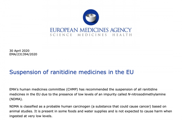 4月30日,欧洲药品管理局EMA发布文件,EMA人药委员会(CHMP)建议停用所有欧盟境内的雷尼替丁药品,因为出现低水平的NDMA杂质。