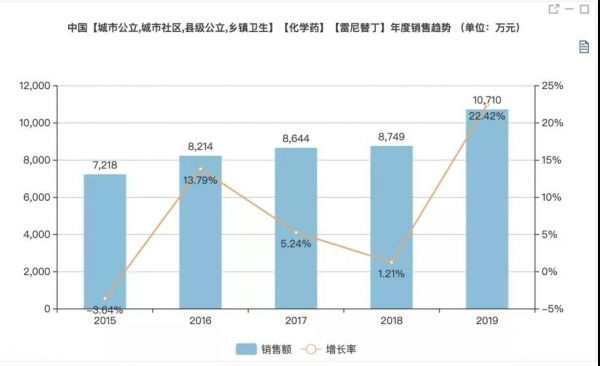 米内网数据显示,2015-2019年中国公立医院终端市场,雷尼替丁一直处于稳步上升趋势,尤其是2019年,增长率达到22%。