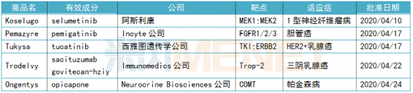 2020年4月,美国FDA批准5款创新药,其中包括治疗1型神经纤维瘤病的Koselugo、治疗胆管癌的Pemazyre、治疗HER2阳性乳腺癌的Tukysa、治疗三阴乳腺癌的Trodelvy,以及治疗帕金森病的Ongentys。获批上市的新药含金量极重,囊括多个突破性疗法、多个首款。