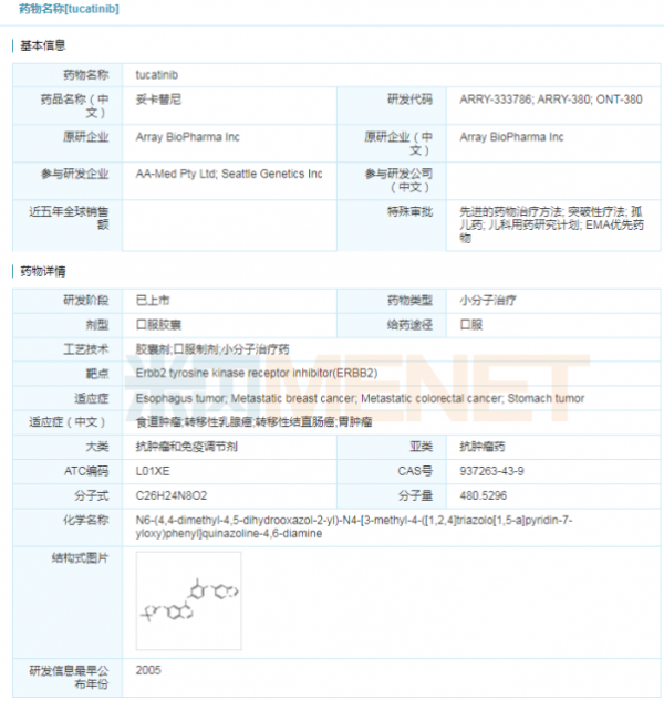 4月18日,西雅图遗传学公司宣布,其靶向抗癌药Tukysa(tucatinib)获得美国FDA批准,与曲妥珠单抗和卡培他滨联合使用,治疗此前已接受至少一次抗人表皮生长因子受体-2(HER2)疗法的晚期无法切除或转移性HER2阳性的乳腺癌成人患者,包括发生脑转移的患者。Tukysa是一种靶向HER2的口服小分子酪氨酸激酶抑制剂(TKI),此前已获得FDA授予的孤儿药资格、突破性药物资格和优先审查。相比FDA目标行动日期提前了4个月获批的Tukysa目前也在接受欧洲药品管理局(EMA)的审查。