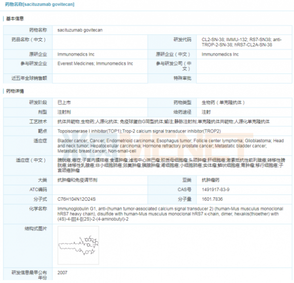 4月22日,美国FDA正式批准Immunomedics公司的抗体偶联药物(ADC)Trodelvy(sacituzumab govitecan-hziy),用于治疗至少接受过两次转移性疾病治疗的三阴性乳腺癌成人患者。Trodelvy是获得FDA批准的首款治疗三阴乳腺癌的抗体偶联药物,也是全球首个获批的靶向人滋养层细胞表面抗原2(Trop-2)的抗体偶联药物。此前,FDA授予了Trodelvy突破性药物资格、快速通道和优先审查。