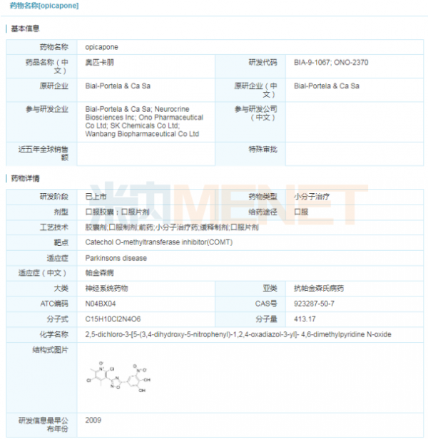 近日,Neurocrine Biosciences公司宣布,美国FDA批准Ongentys(opicapone)作为左旋多巴/卡比多巴辅助治疗药物,治疗经历“关闭”期的帕金森病患者。Ongentys是首款获得FDA批准的可减少“OFF”期时间且不会引起运动障碍的儿茶酚氧位甲基转移酶(COMT)抑制剂。该药最早由BIAL Pharmaceuticals公司研究开发,并于2016年6月在欧盟上市。2017年Neurocrine Biosciences公司在BIAL Pharmaceuticals公司手中获得美国和加拿大的独家开发和商业化权利;2018年,复星医药获得opicapone在中国市场的独家权利。