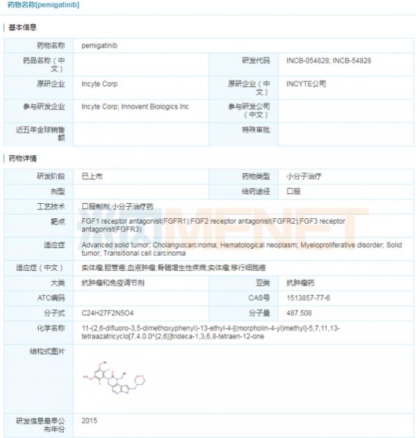 2018年末,信达生物和Incyte公司就Incyte的3个临床阶段候选药物达成了战略合作,包括pemigatinib、itacitinib和parsaclisib。信达生物拥有以上3个药物在中国(包括香港/澳门、台湾地区)的开发和商业化权利。pemigatinib国内已启动2期临床试验,信达生物在2020年3月宣布pemigatinib完成中国首例患者给药。