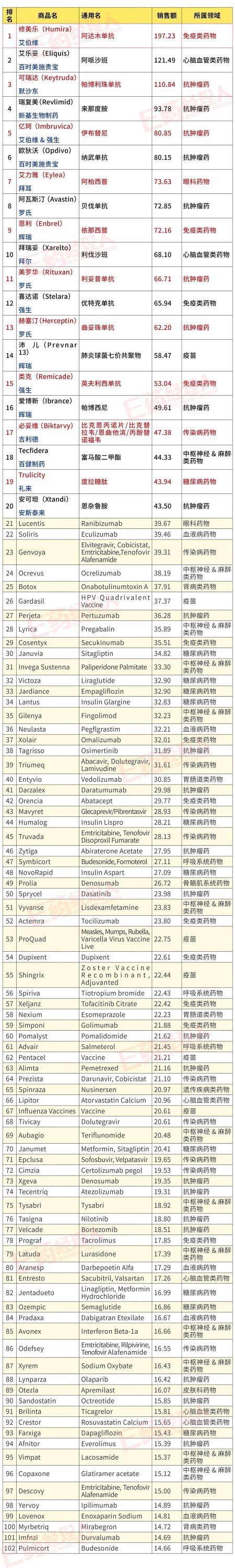 附:2019年全球销售额TOP200药物排名表(单位:亿美元)