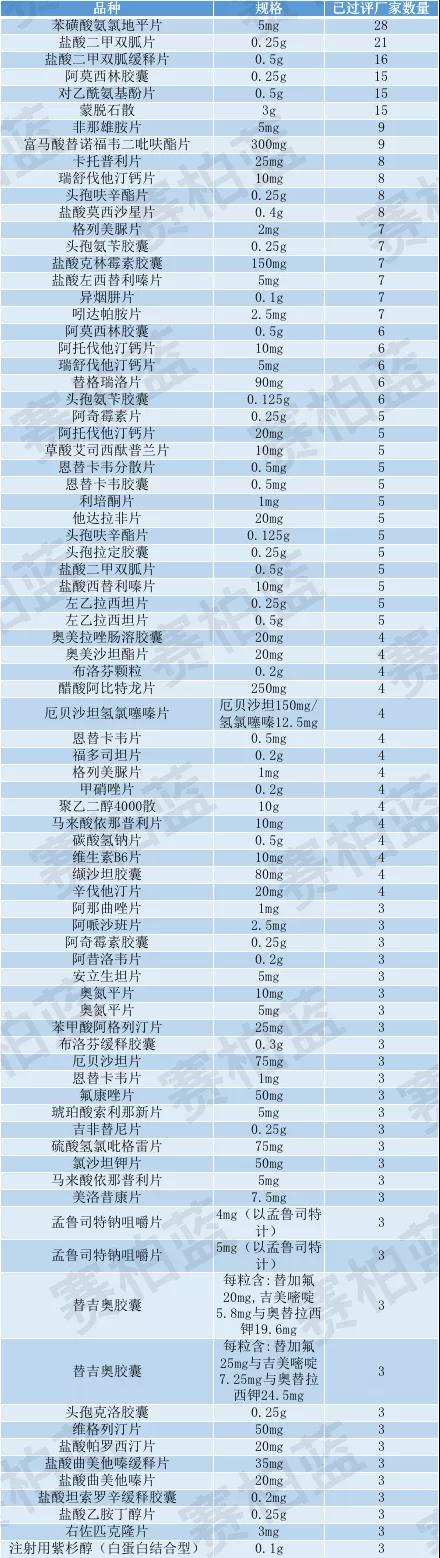 过评企业已满三家的品规汇总
