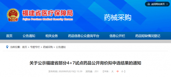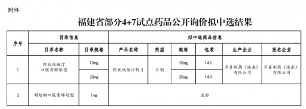 5月19日,福建省医保局公示了《部分4+7试点药品公开询价拟中选结果》,齐鲁制药的阿托伐他汀钙片通过公开询价获得拟中选资格,利培酮片则流标。