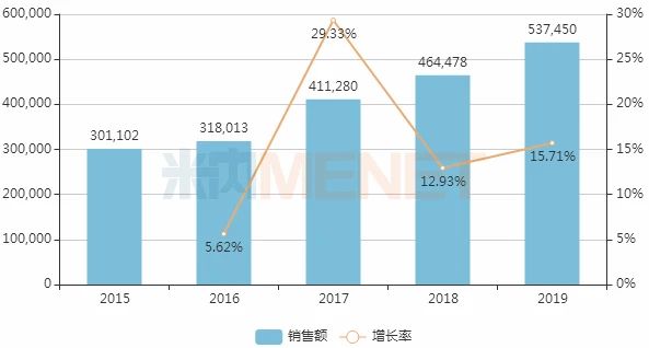 图2:2015-2019年中国公立医疗机构终端艾司奥美拉唑销售情况(单位:万元)