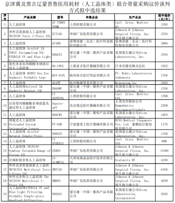5月18日,京津冀医用耗材联合采购平台发布《京津冀及黑吉辽蒙晋鲁医用耗材(人工晶体类)联合带量采购议价谈判方式拟中选结果公示》,公布3+6耗材谈判中标械企及价格。