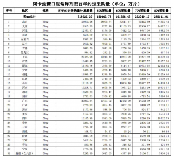 在全国集采中,阿卡波糖50mg首年约定采购量为3.18亿片,采购有效期原则定为2年。以下为各地阿卡波糖首年约定采购量:
