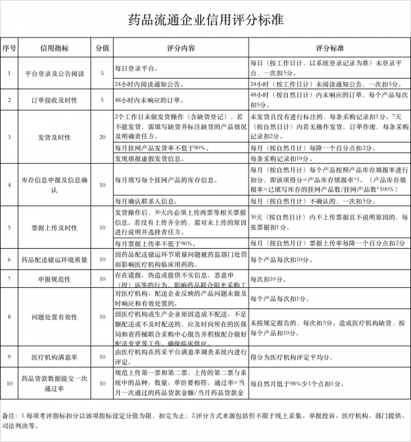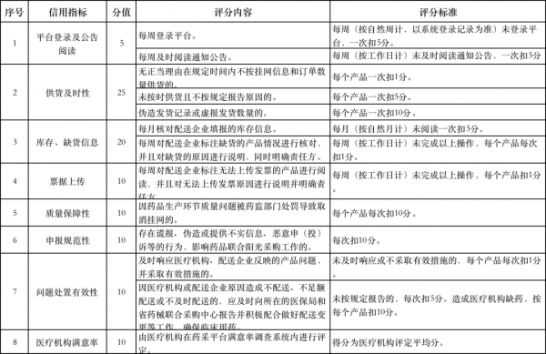其评分内容主要为无正当理由在规定时间内不按挂网信息和订单数量供货的;未按时供货且不按规定报告原因的;伪造发货记录或虚报发货数量的。
