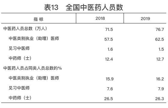 《公报》显示,2019年末,全国中医药卫生人员总数达76.7万人,比上年增加5.2万人(增长7.2%)。其中:中医类别执业(助理)医师62.5万人,中药师(士)12.7万人。两类人员较上年均有所增加。
