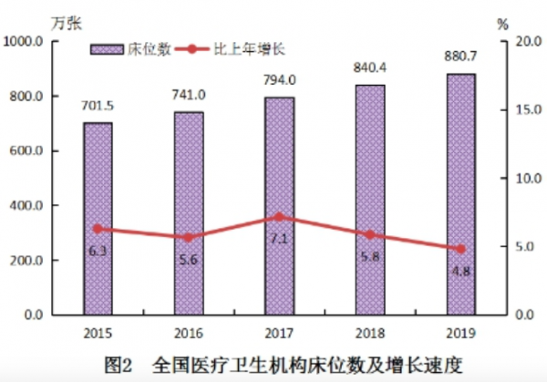 此外,在床位数方面,到2019年末,全国医疗卫生机构床位880.7万张,其中:医院686.7万张(占78.0%),基层医疗卫生机构163.1万张(占18.5%),专业公共卫生机构28.5万张(占3.2%)。