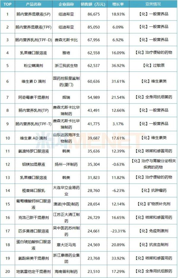从增速来看,有5个品牌增速超过20%,其中浙江我武生物的粉尘螨滴剂、浙江康德药业集团的氨酚麻美干混悬剂、国药控股星鲨制药(厦门)的维生素D滴剂增速更是超过了30%。