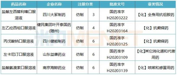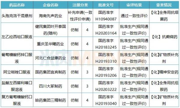 四川大冢制药的盐酸左西替利嗪口服溶液、健民集团叶开泰国药(随州)的左乙拉西坦口服溶液按新分类获批视同通过一致性评价。丙戊酸钠口服溶液、左卡尼汀口服溶液、盐酸氨溴索口服溶液3个产品目前暂无企业过评。
