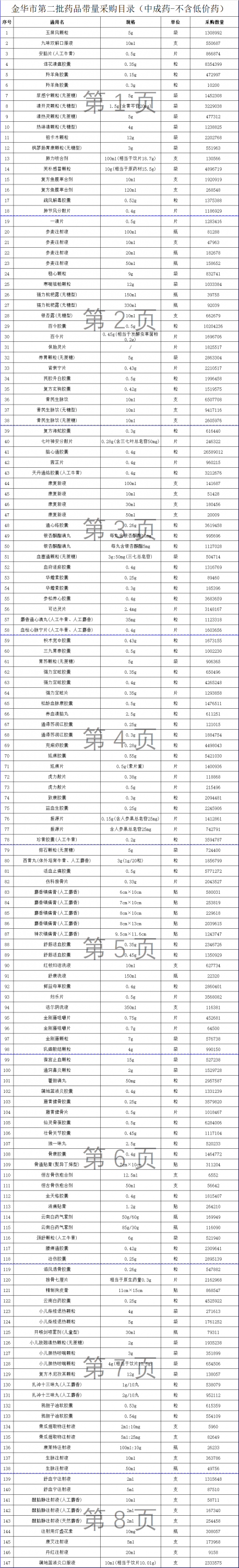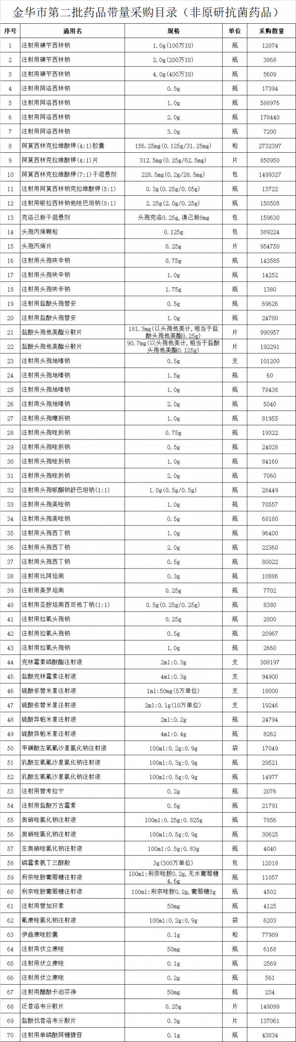 根据带量采购药品公示目录,金华市第二批带量采购涉及:70个非原研抗菌药,包括注射用阿洛西林钠、阿莫西林克拉维酸钾胶囊、注射用头孢呋辛钠、盐酸克林霉素注射液、注射用美罗培南、磷酸奥司他韦颗粒等;24个原研抗菌药,包括注射用头孢呋辛钠、注射用头孢曲松钠、注射用哌拉西林钠他唑巴坦钠、注射用亚胺培南西司他丁钠等;147个中成药(不包含低价药)和33个中成药(包含低价药),包括复方鱼腥草合剂、牛黄上清胶囊、清开灵颗粒、疏风解毒胶囊、、参麦注射液、强力枇杷露、百令胶囊、六味地黄丸、安神补脑液等。