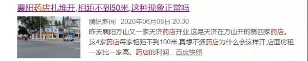 6月8日,据腾讯新闻客户端自媒体账号消息,襄阳万山又一家天济药店开业,这是天济在万山开的第四家药店,而且这4家药店每家相距不到100米。