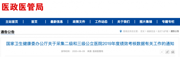 6月9日,国家卫健委发布《关于采集二级和三级公立医院2019年度绩效考核数据有关工作的通知》。