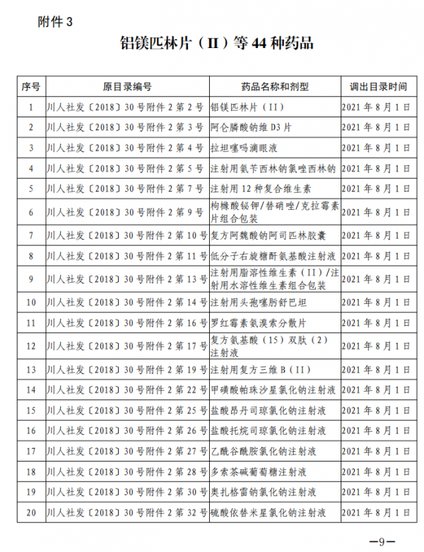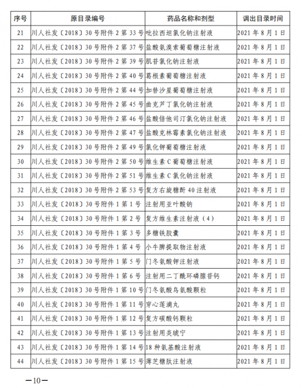 除了上述100个药要在今年7-8月前调出外,四川省同时公布了44个品种,放宽了调出时间,要求其在2021年8月1日前调出目录,44个药品包括铝镁匹林片(II)、阿仑膦酸钠维D3片、多索茶碱葡萄糖注射液、罗红霉素氨溴索分散片、小牛脾提取物注射液、门冬氨酸鸟氨酸颗粒、门冬氨酸钾注射液等。