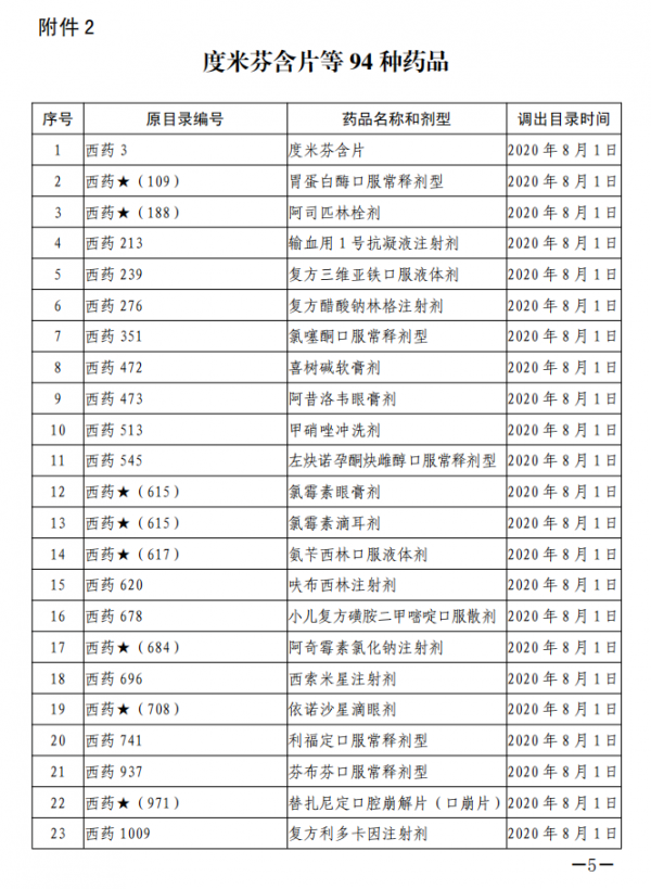 此外,包括度米芬含片、胃蛋白酶口服常释剂型、阿斯匹林栓剂、输血用1号抗凝液注射剂、复方三维亚铁口服液体剂在内的28个西药,包括板蓝根咀嚼片、穿心莲内酯片、九味抗病毒颗粒、益肝颗粒、小儿定风丸、川贝止咳糖浆等52个中成药,以及包括复方依那普利片、二甲双胍马来酸罗格列酮片、磷酸川穹嗪葡萄糖注射液在内的14个药,均要求在8月1日前被调出医保目录。