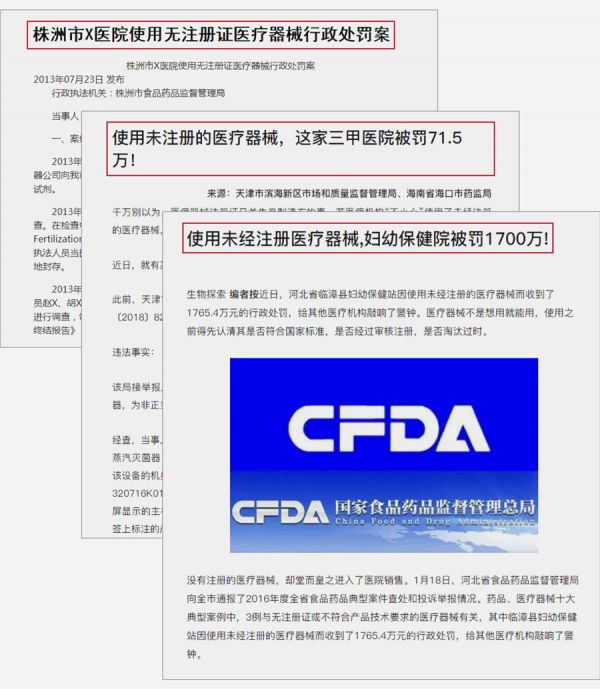 2016年8月1日,临漳县食品药品监督管理局根据群众举报,对临漳县妇幼保健院执法检查。经查,该院因使用未经注册的医疗器械而收到了1765.4万元的行政处罚,给整个医疗器械行业敲了警钟。