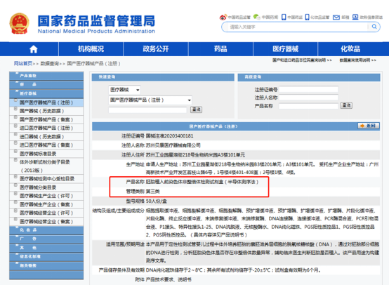 三类医疗器械是最高级别的医疗器械,也是必须严格控制的医疗器械,是指植入人体,用于支持、维持生命,对人体具有潜在危险,对其安全性、有效性必须严格控制的医疗器械。 PGS试剂盒属于三类医疗器械,据国家药品监督管理局官网发布的公示显示目前国内已有PGS试剂盒获批上市『胚胎植入前染色体非整倍体检测试剂盒(国械注准:20203400181)』。按照国家医疗器械相关法律强制性规定,任何医疗机构(包括医院、医学检验所、医学检验中心等)在开展临床应用项目时,均应当使用有注册证的医疗器械,产品开发依托的平台也必须获得三类医疗器械注册证。
