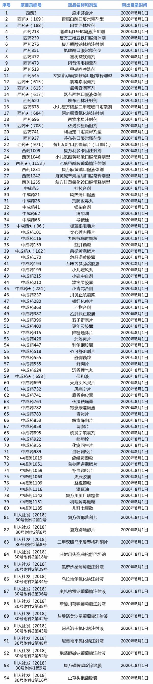 2020年8月1日起调出品种