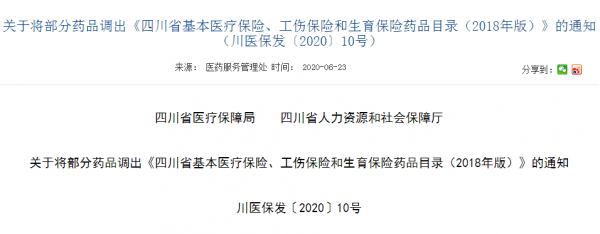6月23日,四川发布关于将部分药品调出《四川省基本医疗保险、工伤保险和生育保险药品目录(2018年版)》的通知(下称《通知》),将分三个时间节点调出142个品种。其中,纳入国家重点监控范围的转化糖电解质注射剂等6种药品于2020年7月1日起调出;度米芬含片等92种药品于2020年8月1日起调出;铝镁匹林片(Ⅱ)等44种药品于2021年8月1日起调出。