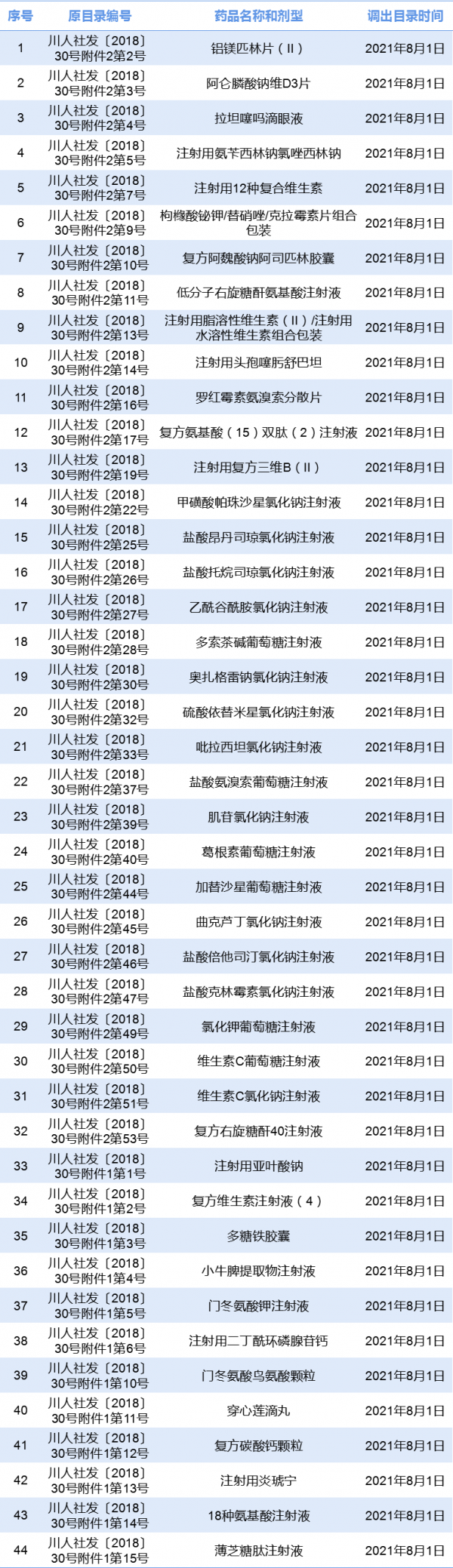此外,铝镁匹林片(Ⅱ)等44种药品均是《四川省人力资源和社会保障厅关于执行<四川省基本医疗保险、工伤保险和生育保险药品目录(2018年版)>有关问题的通知》(川人社发〔2018〕30号)规定实行报销过渡期的药品。目前,参保人员和部分医疗机构仍在使用,为保障参保人员用药连续性,支持医药企业复工复产和疫情防控,给予一定缓冲时间,规定从2021年8月1日起调出医保目录。