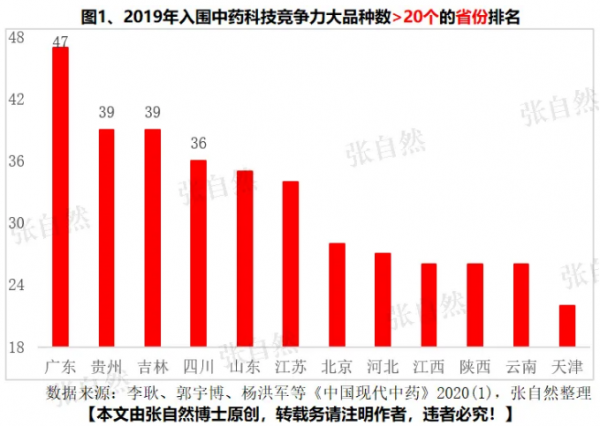 入围2019年中药大品种科技竞争力排行榜产品最多的省份是广东,共有47个品种入围,其中广州白云山旗下企业就占了16个,分别是消渴丸、小儿七星茶颗粒、广东凉茶颗粒、华佗再造丸等知名品牌;位居其后的是贵州和吉林,各有39个品种入围,贵州入围品种数最多的企业是贵州益佰,有7个(克咳胶囊、金骨莲胶囊、复方斑蝥胶囊等),吉林入围最多的企业是通化金马,有3个(壮骨伸筋胶囊、治糜康栓、风湿祛痛胶囊)入围。入围大品种数最多的前8个省份(广东、贵州、吉林、四川、山东、江苏、北京、河北)占了全国的一半,共有285个品种入围。