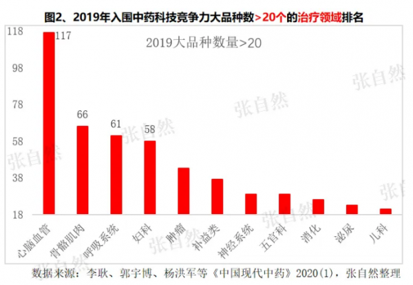 按治疗领域分,入围品种数最多的是治疗心脑血管疾病的药品,共有117个入围,占了全国总数的1/5,如脑心通胶囊(步长)、麝香保心丸(上海和黄)等;骨骼肌肉、呼吸系统和妇科用药紧追其后,分别有66、61和58个品种入围,上述前4个治疗领域占了2019中药大品种总数的的一半以上(53%)。