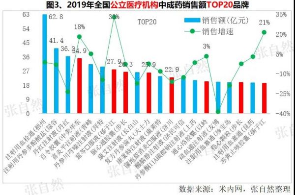 2019年全国公立医疗机构(城市公立医院、县级公立医院、城市社区中心(站)和乡镇卫生院)销售额最大的中成药是注射用血栓通,达62.8亿元,在销售额TOP20中,增速最快的是扬子江的蓝芩?服液,增速高达33%。近年来,随着对辅助用药的限制和合理用药的加强,中药注射剂受到了很大影响,销售额TOP20品种中,中药注射剂数量逐渐减少,口服中成药数量逐渐增多,2019年TOP20中已有8个口服中成药入围(图3中红色柱),而此前TOP20则只有几个口服品种,其他绝大多数是中药注射剂。