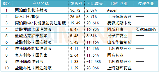 2019年中国公立医疗机构终端化学药麻醉剂产品TOP10(单位:亿元)