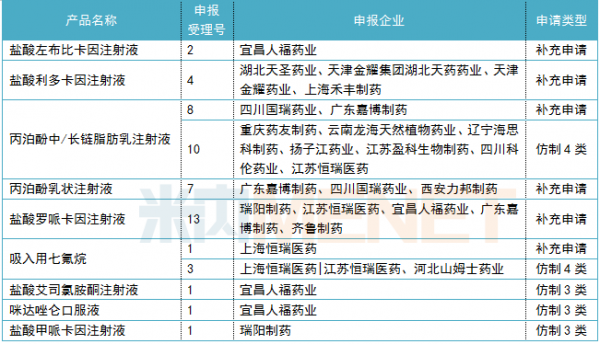 目前,正在审评的一致性评价补充申请和按新注册分类申报上市的麻醉剂有9个,涉及受理号超过40个。其中,7个产品没有企业过评;而盐酸利多卡因注射液、丙泊酚中/长链脂肪乳注射液、丙泊酚乳状注射液等4个产品最为抢手,申报企业均有3家或以上,涉及宜昌人福药业、江苏恒瑞医药、扬子江药业、四川科伦药业、江苏恩华药业等企业,谁将能先拔头筹呢?我们拭目以待。