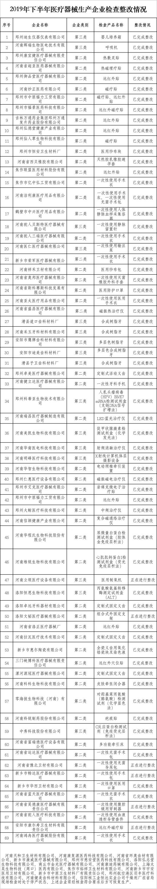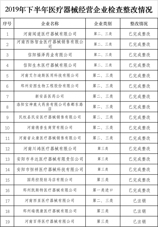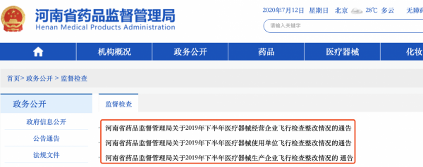日前,河南省药监局发布了三则关于2019年下半年关于医疗器械检查整改情况的通告,涉及经营企业、生产企业、使用单位。