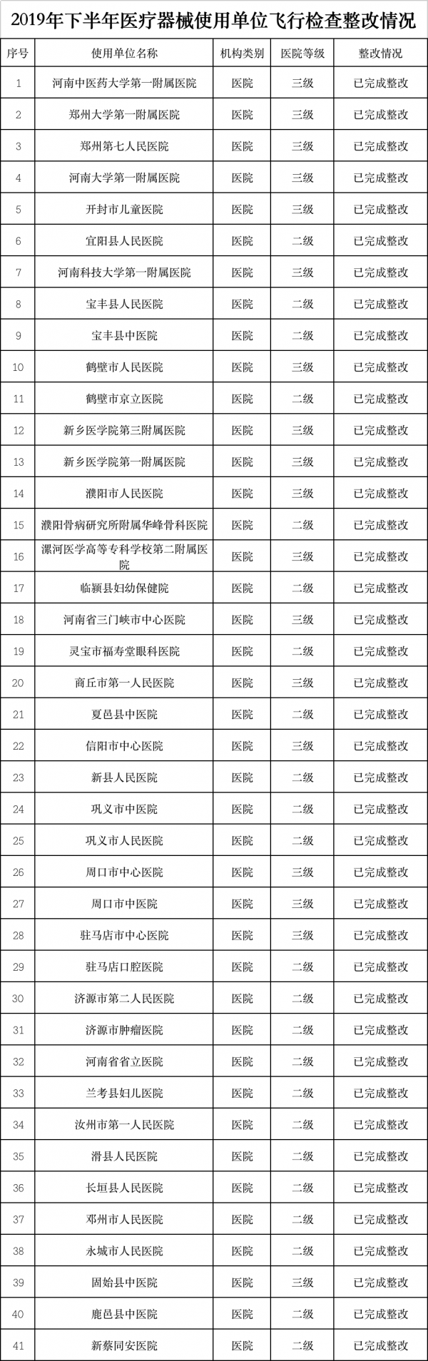 2019年下半年,依据《药品医疗器械飞行检查办法》,河南省药品监督管理局共组织对41家医疗器械使用单位开展了飞行检查。