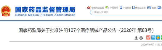 7月14日,国家药监局官网发布《国家药监局关于批准注册107个医疗器械产品公告(2020年 第83号)》。