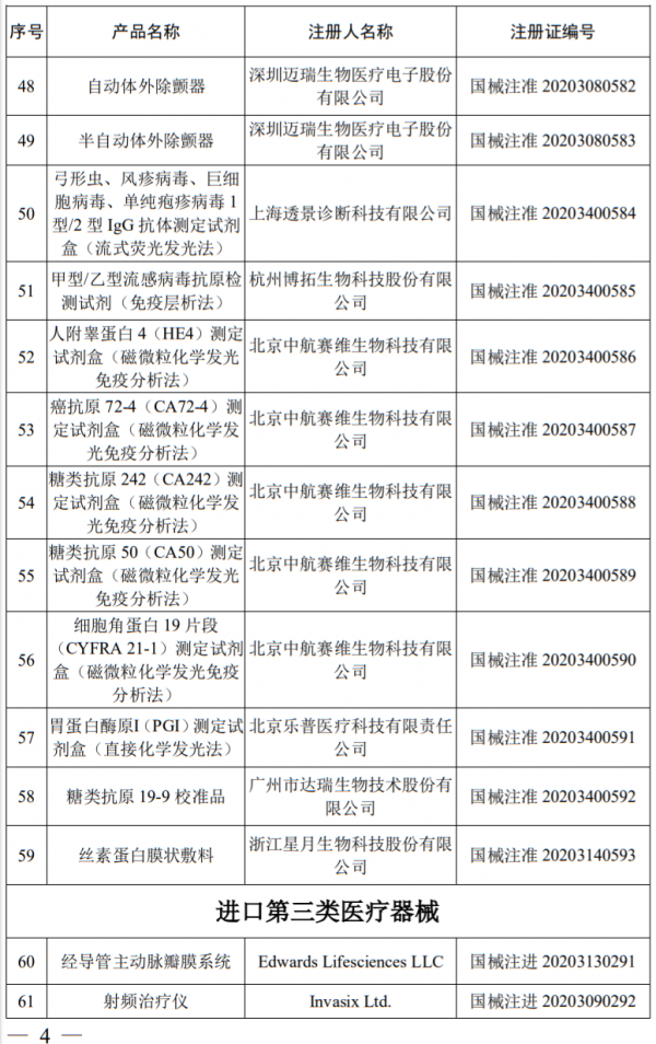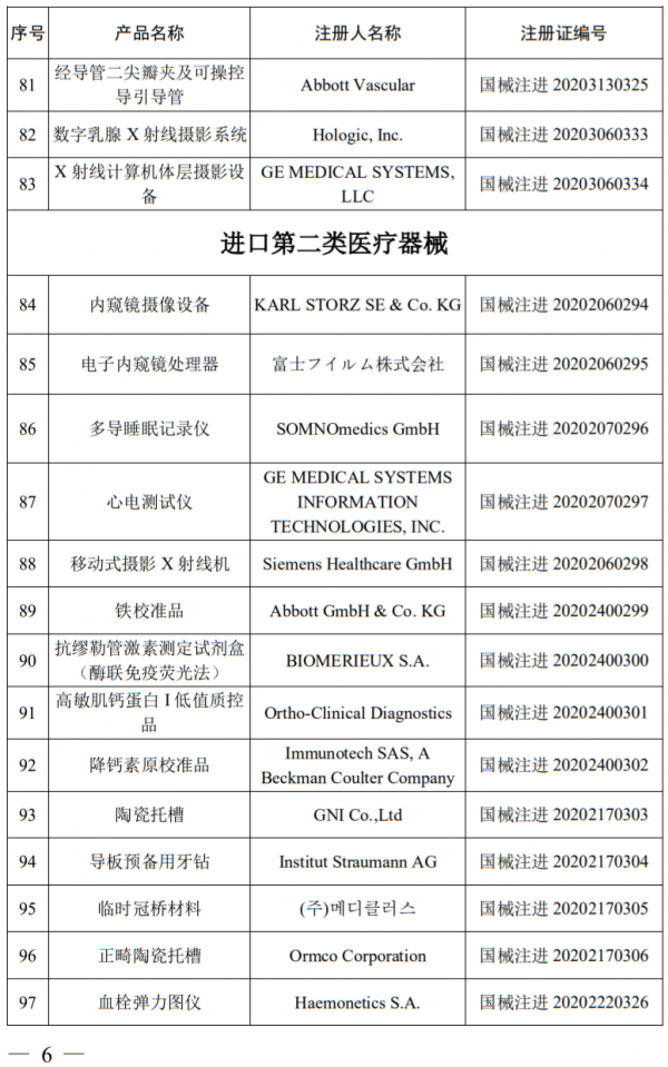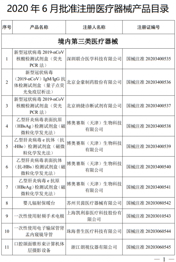 公告显示,2020年6月,国家药品监督管理局共批准注册医疗器械产品107个。其中,境内第三类医疗器械产品59个,进口第三类医疗器械产品24个,进口第二类医疗器械产品24个。