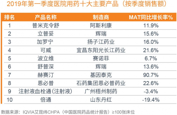 就具体产品来看,扬子江药业的加罗宁,同比增长8.5%,仍然位居第一;阿斯利康的普米克令舒同比略微下降0.3%,位居第二名;辉瑞的舒普深、石药集团的恩必普、东阳光药的可威,罗氏的赫赛汀,分别以11.6%、31.8%、37.8%、34.4%位居第三至六名。