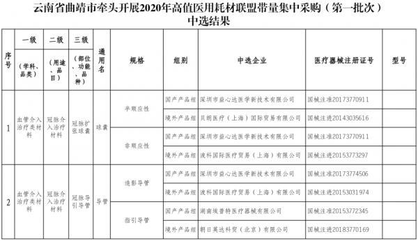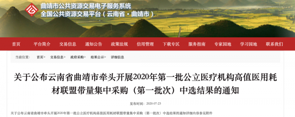 7月23日,云南省曲靖市牵头开展2020年第一批公立医疗机构高值医用耗材联盟带量集中采购(第一批次)中选结果公布。