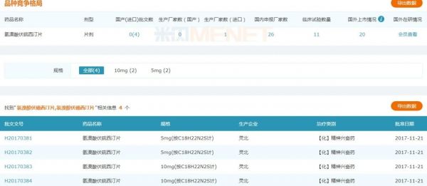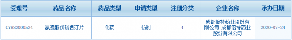 7月24日,CDE官网显示,成都倍特药业的氢溴酸伏硫西汀片4类仿制上市申请获得受理。米内网数据显示,2019年中国公立医疗机构终端伏硫西汀片剂销售额3086万元,生产企业仅有灵北一家。在此之前,扬子江和正大天晴药业集团分别以仿制3类、4类提交上市申请,在审评审批中(在药审中心)。