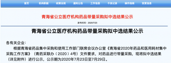 7月23日,青海省公立医疗机构药品带量采购拟中选结果公示。