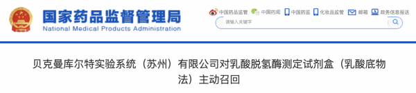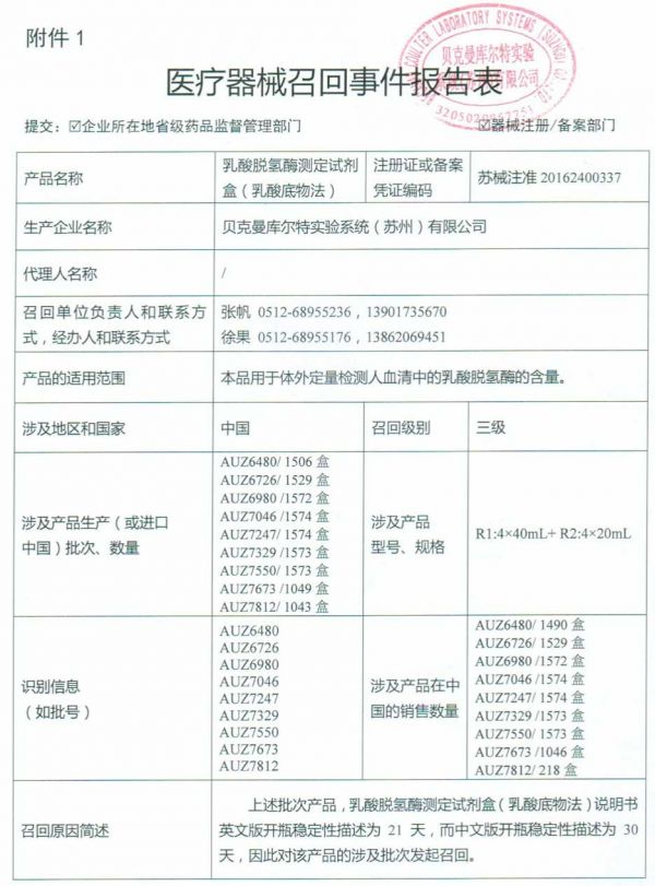 日前,国家药监局发布消息,贝克曼库尔特实验系统(苏州)有限公司报告,乳酸脱氢酶测定试剂盒(乳酸底物法)说明书英文版开瓶稳定性描述为21天,中文版开瓶稳定性为30天,两个版本不一致,故实施主动召回,召回级别为三级。