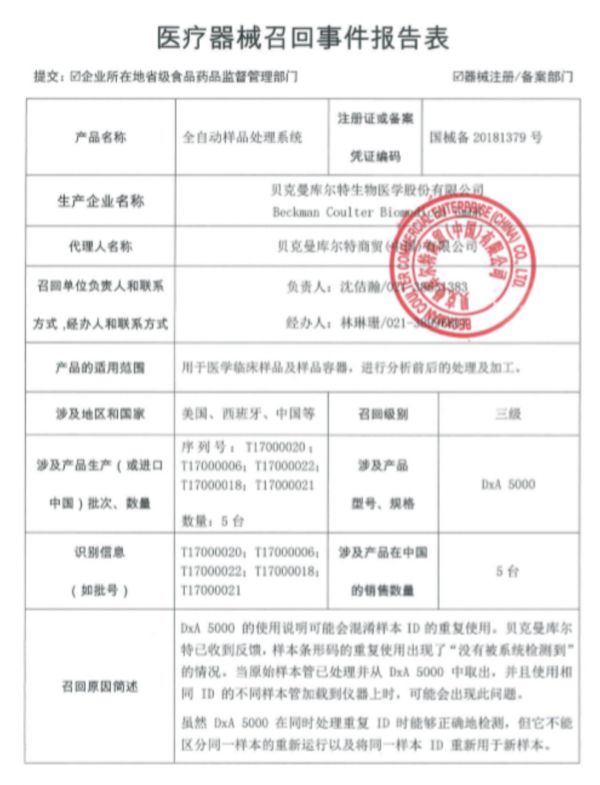 6月30日,上海市药监局发布召回通知,贝克曼对涉及在中国销售的5台全自动样品处理系统主动召回,级别为3级,该产品用于医学临床样品及样品容器,进行分析前后的处理及加工。报告表示,由于涉及产品因DxA 5000 的使用说明可能会混淆样本ID的重复使用,故实施主动召回。