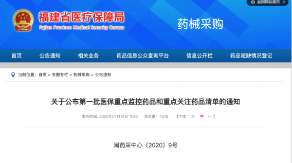 为加强医保重点监控药品监管,进一步控制医药费用不合理增长,提高合理用药水平,医改先锋福建在2019年4月发布《福建省医疗保障局关于加强医保重点监控药品管理的通知》,确定该省医保重点监控药品的确定程序。福建明确,当药品出现下列情形时,将被纳入评估范围: