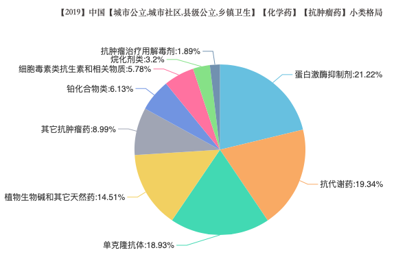 在抗肿瘤药方面,目前国际上临床常见的抗肿瘤药物约80余种。其中,在我们临床上使用最多的是蛋白激酶抑制剂,市场占比达到21.22%,其次是抗代谢药19.34%,单克隆抗体18.93%。