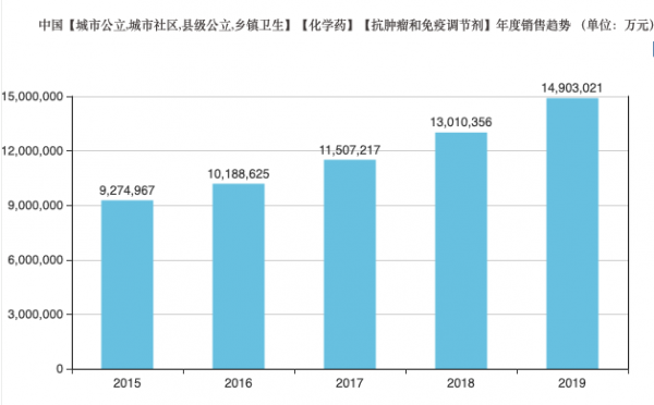 根据米内网数据显示,2019年中国抗肿瘤和免疫调节药物市场规模高达1490.3亿元,同比增长14.55%,有着巨大的市场发展前景和潜力。