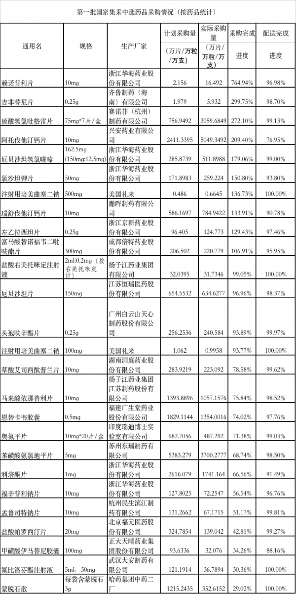 其中赖诺普利片、吉非替尼片、硫酸氢氯吡格雷片、阿托伐他汀钙片、厄贝沙坦氢氯噻嗪、氯沙坦钾片、注射用培美曲塞二钠、瑞舒伐他汀钙片、左乙拉西坦片、富马酸替诺福韦二吡呋酯片等10个中选药品已完成全年计划采购量,采购进度完成最快的赖诺普利片采购进度已达764.94%。